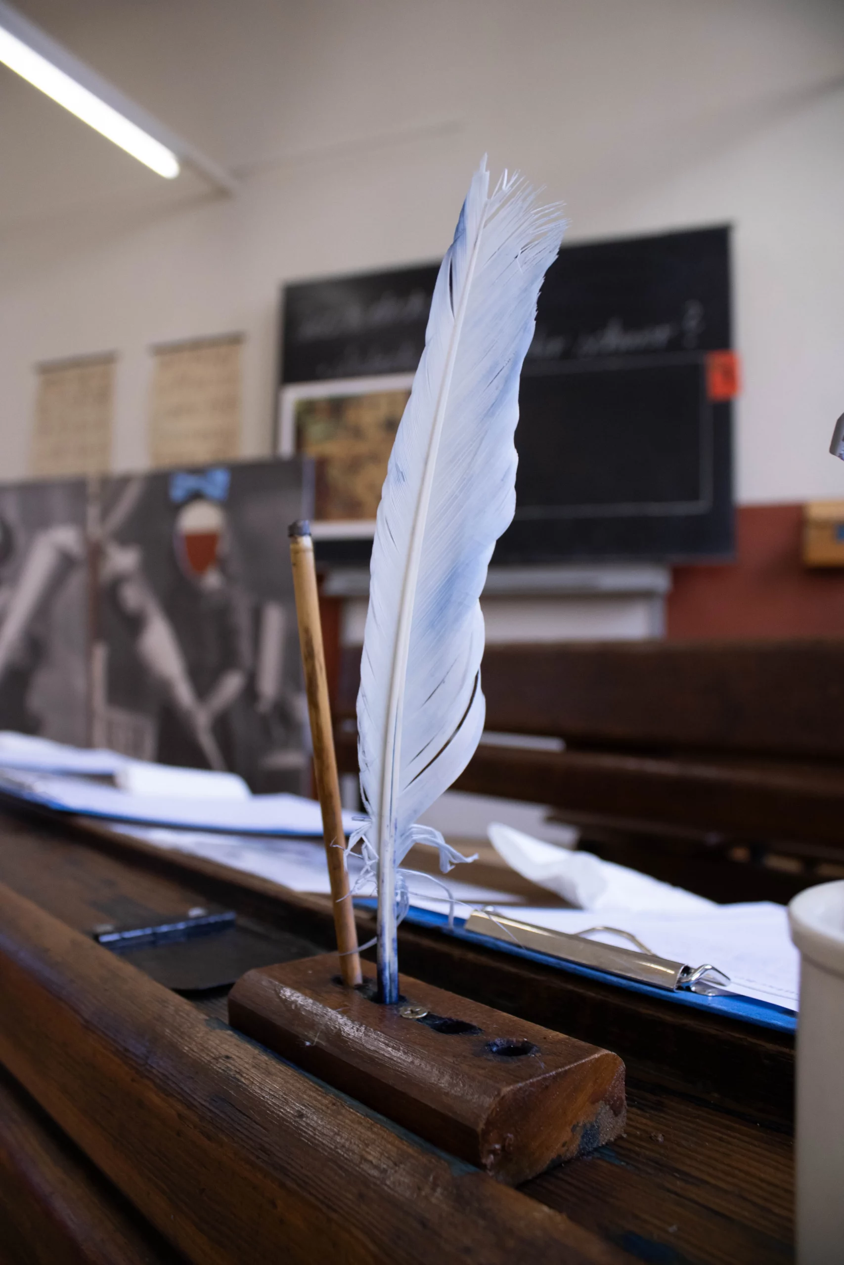 Gleich hinter der ersten Tür werden Sie von unseren Kolleg:innen im Besucherzentrum empfangen. Hier finden Sie hilfreiche Informationen über das gesamte Museum, um Ihnen einen anregenden Einstieg in die folgenden Epochenräume zu geben. In diesem Zimmer befindet sich auch eine Schreibstation mit historischen Schulbänken, an der sich Kinder und Erwachsene im Schreiben mit Feder und Tinte versuchen können. Zudem gibt es Vitrinen für Sonderausstellungen, deren Inhalt regelmäßig mit neuen interessanten Artefakten aus unseren Sammlungen gefüllt werden.