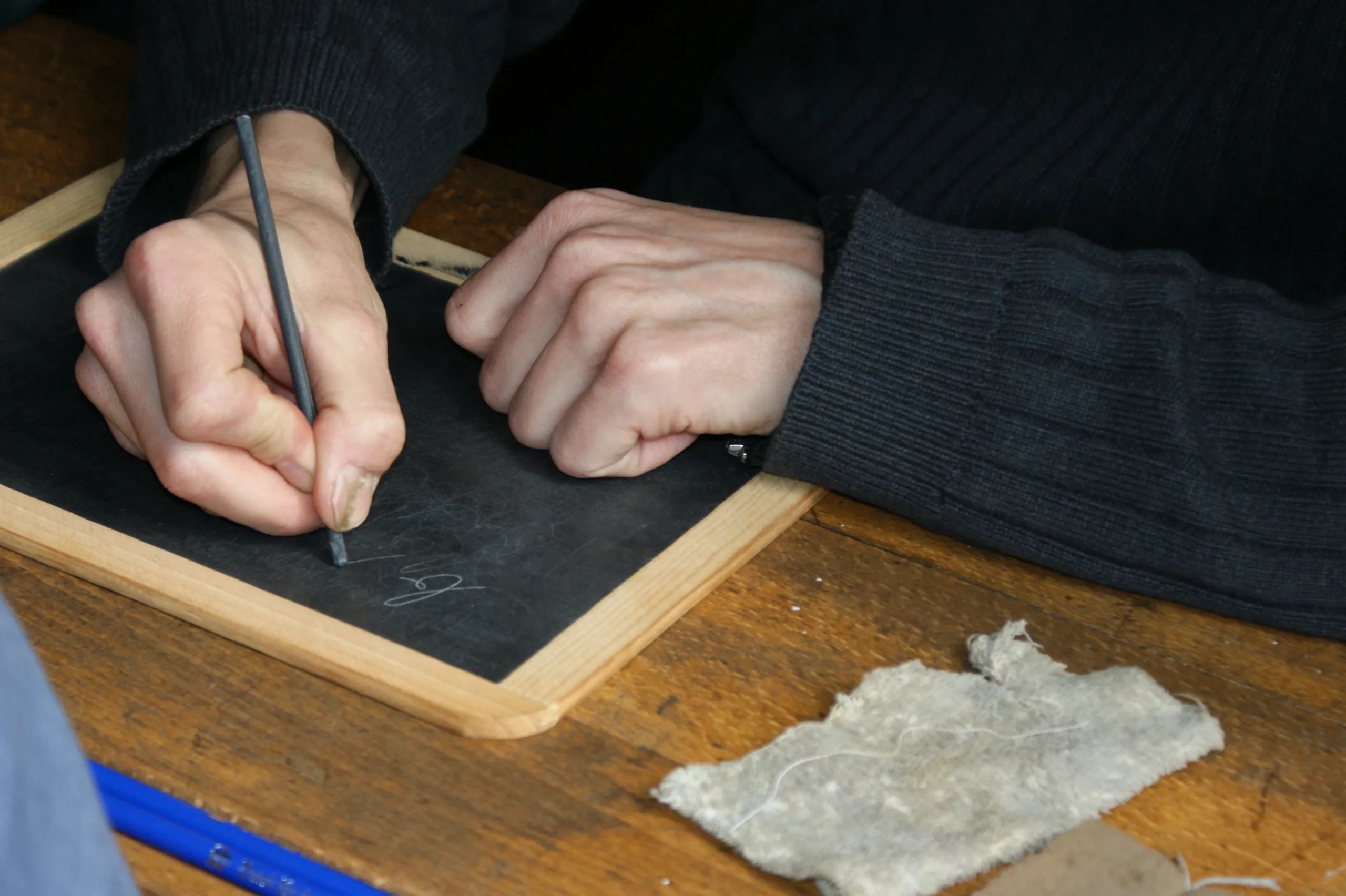 In unserem Klassenzimmer der Zeit um 1900 hält Herr Lehrer oder Fräulein Lehrerin eine Schulstunde mit allem, was dazu gehört: Aufrechtes Sitzen, gemeinsames Beten und Sprechen in ganzen Sätzen. Die Schüler:innen haben die Möglichkeit, den Umgang mit Griffel und Schiefertafel zu probieren und es wird dem Schönschreiben in deutscher Schreibschrift besondere Bedeutung geschenkt. Im Anschluss an unsere gemeinsame Unterrichtsstunde schauen wir uns die Strafen an, wie dem Schlagen mit dem Rohrstock, und demonstrieren diese symbolisch, da sie damals zum Schulalltag gehörten.