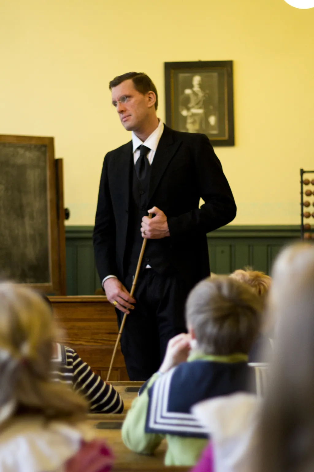 In unserem Klassenzimmer der Zeit um 1900 hält Herr Lehrer oder Fräulein Lehrerin eine Schulstunde mit allem, was dazu gehört: Aufrechtes Sitzen, gemeinsames Beten und Sprechen in ganzen Sätzen. Die Schülerinnen und Schüler haben die Möglichkeit, den Umgang mit Griffel und Schiefertafel zu probieren und es wird dem Schönschreiben in deutscher Schreibschrift besondere Bedeutung geschenkt. Im Anschluss an unsere gemeinsame Unterrichtsstunde schauen wir uns die Strafen an, wie dem Schlagen mit dem Rohrstock, und demonstrieren diese symbolisch, da sie damals zum Schulalltag gehörten.